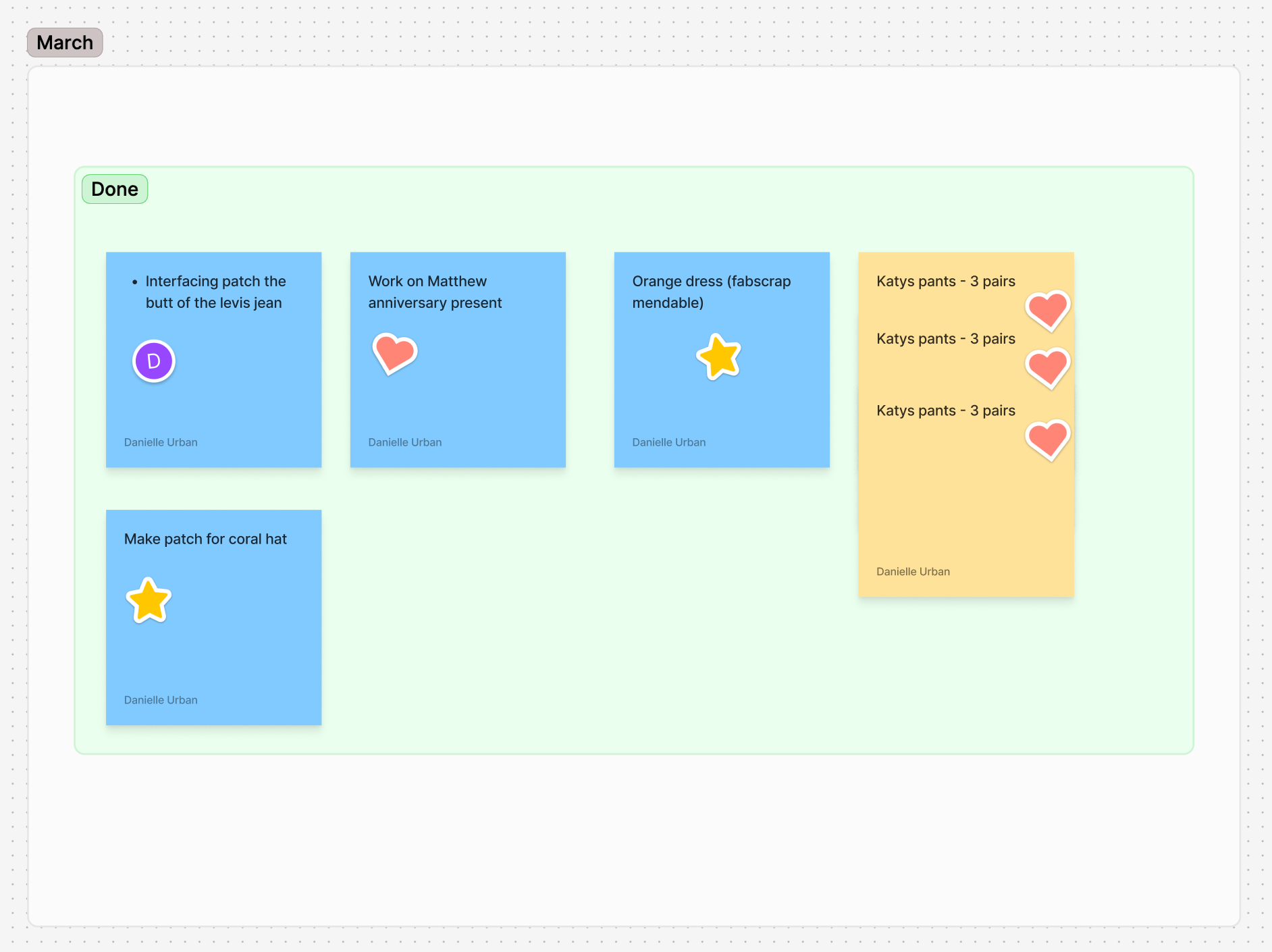 In a way, I didn’t accomplish either of these goals… in another way you could say I exceeded them? Let me explain. The goal of finishing a bunch of in progress projects was born out of being tired of the overflowing bins of stuff in my house (people in nyc apartments I’m sure feel my pain). At the start of the year I made myself a virtual whiteboard and assigned different projects to the bins for different months, but I didn’t actually keep up with that method of tracking things at all, and I haven’t even looked at that virtual whiteboard in months (adhd girlies rise up). So I went back to take a look, and I was surprised that I’d actually completed most of the projects. It was also fun to, after the fact, make sticky notes for all the projects that I ended up completing that weren’t in my brain in February when I compiled my list.